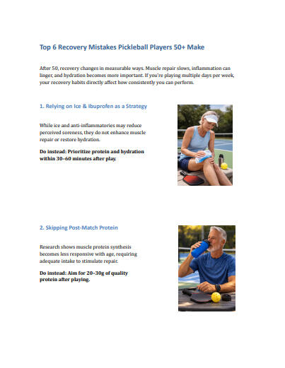 Join our mailing list (below), and we'll throw in our recovery guide: The top 6 recovery mistakes pickleball players 50+ make (and how to avoid them).